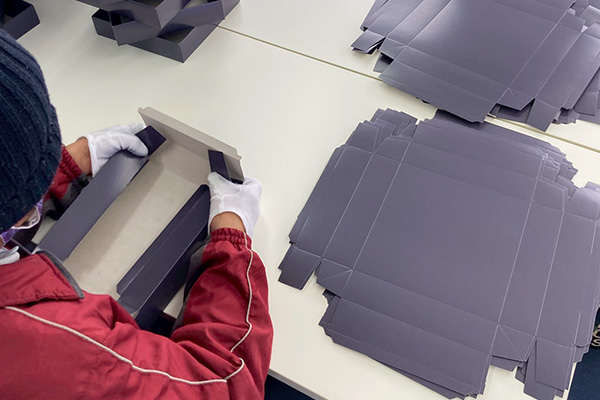 サイレントフットでは活動の一環として「お菓子の箱折り」作業を行っています。平らな箱を折り込み、きれいな形に仕上げるシンプルなお仕事です。丁寧さや集中力を生かしながら、安心して取り組める作業です。